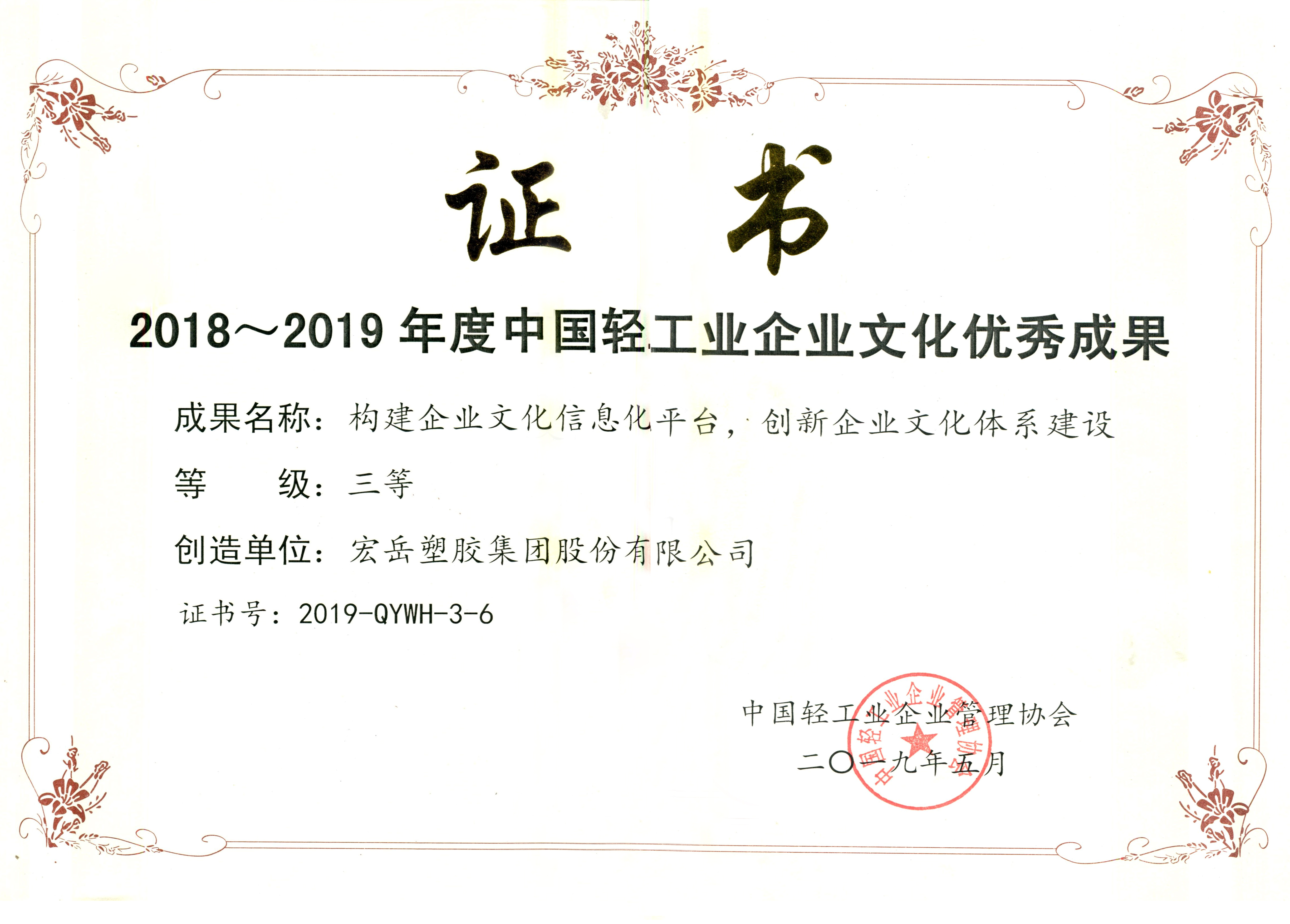 5月17日,中国轻工业企业管理协会第四届第五次理事(扩大)会议暨2019年轻工业企业文化建设经验交流会在郑州召开,leyu.乐鱼集团申报的“构建企业文化信息化平台,创新企业文化体系建设”项目成果荣获2018~2019年度中国轻工行业企业文化优秀成果三等奖。
