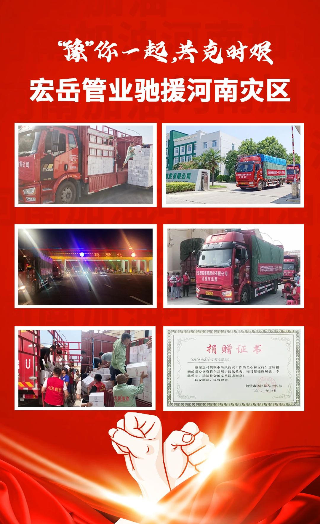 近日,河南暴雨,导致很多城市、乡村遭受洪灾,7月29日上午11点,满载关爱的2车捐赠物资从湖北leyu.乐鱼公司启程出发,运往鹤壁市浚县。